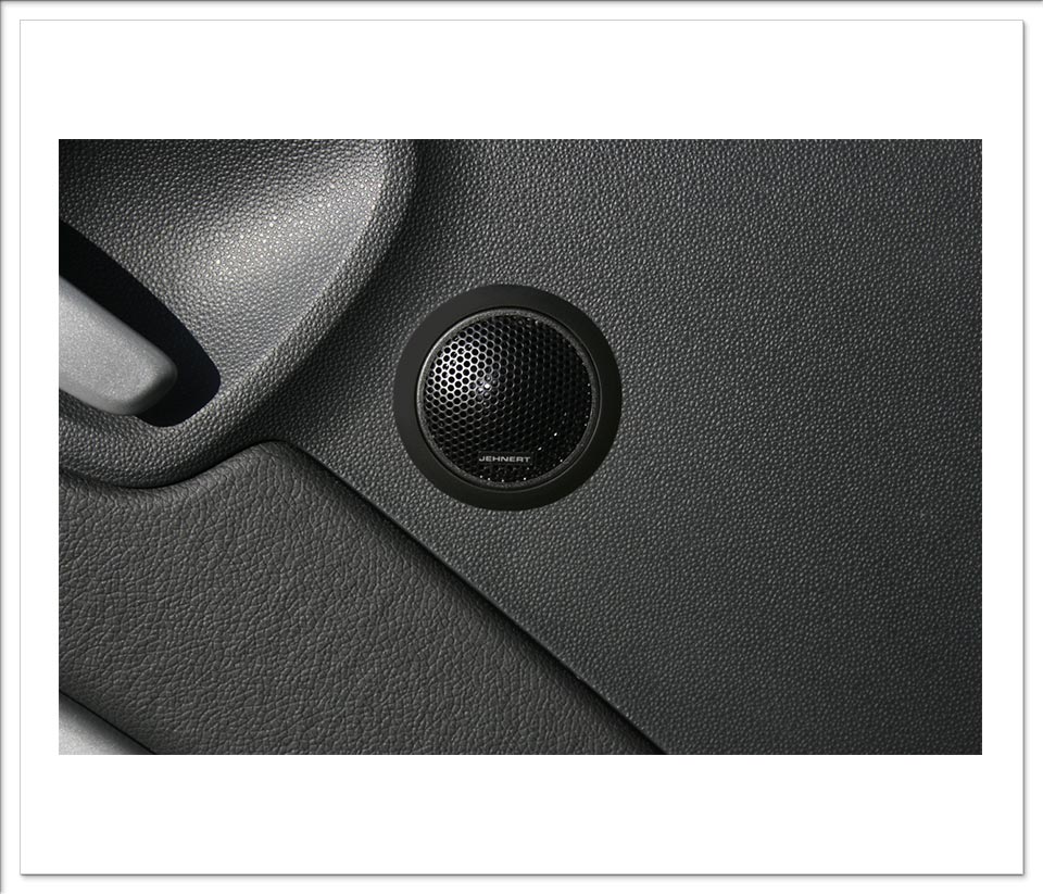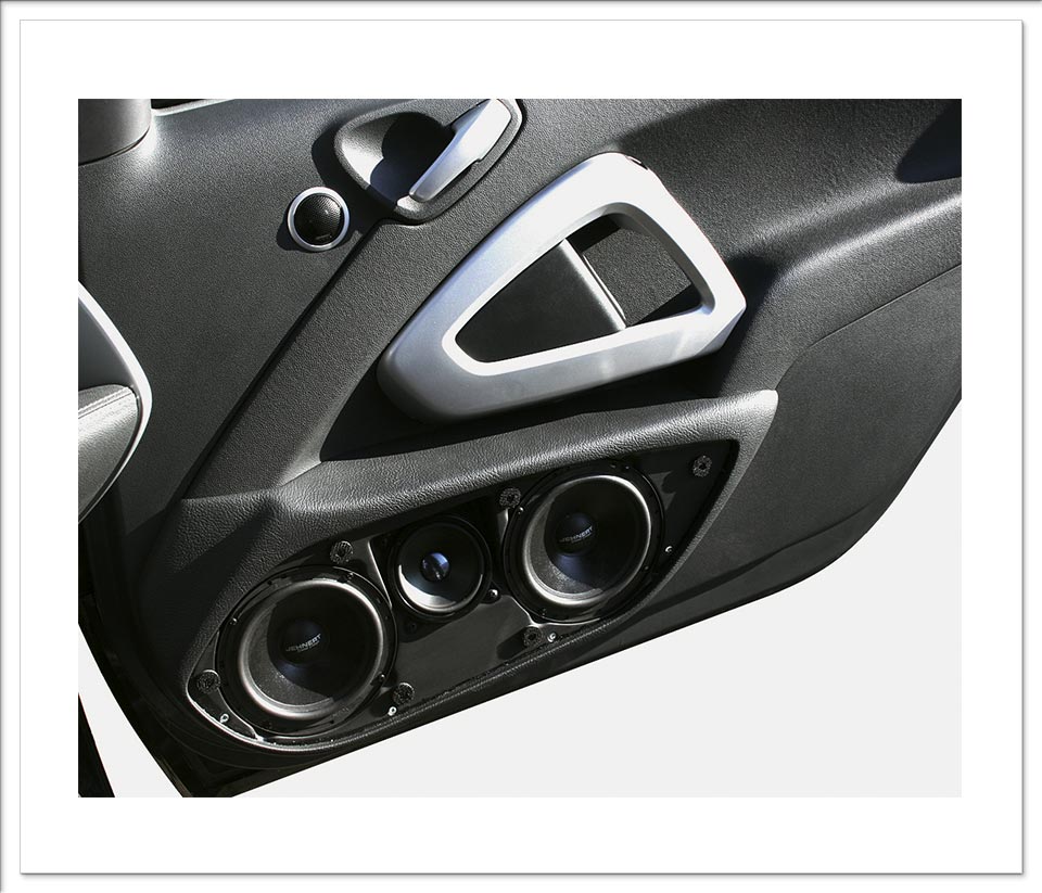 Το 2-πλό σύστημα subwoofer συνδέεται μαζί με το midrange στο Doorpanel. Αποδίδει εντυπωσιακή δυναμική στην περιοχή των χαμηλών συχνοτήτων. Η γωνία κλίσης που έχει δημιουργηθεί συγκεκριμένα για αυτό το αυτοκίνητο, εγγυάται ένα άψογο ηχητικό αποτέλεσμα. Το υψηλής ποιότητα tweeter neodymium 26mm (1″) αντικαθιστά το εργοστασιακό, στην ίδια βάση και θέση του αυτοκινήτου.